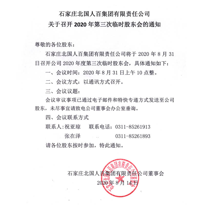石家庄北国人百集团有限责任公司关于召开2020年第三次临时股东会的通知