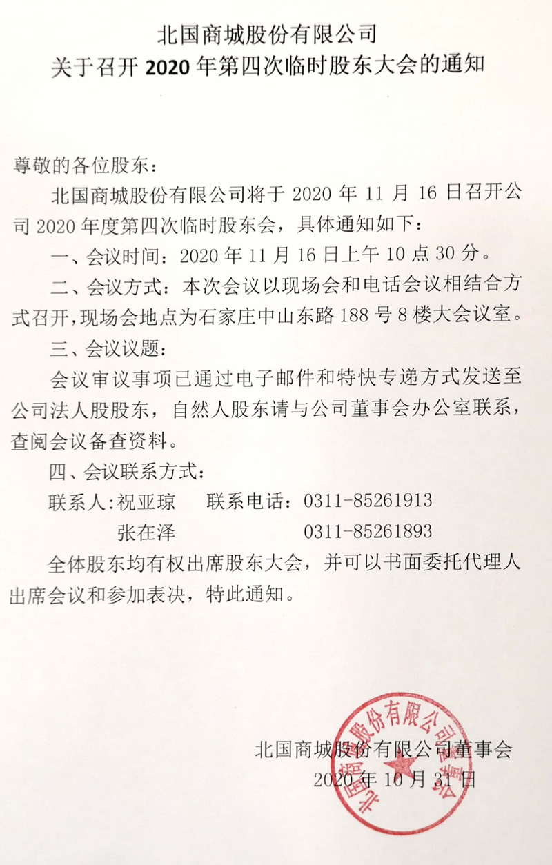 北国商城股份有限公司关于召开2020年第四次临时股东大会的通知