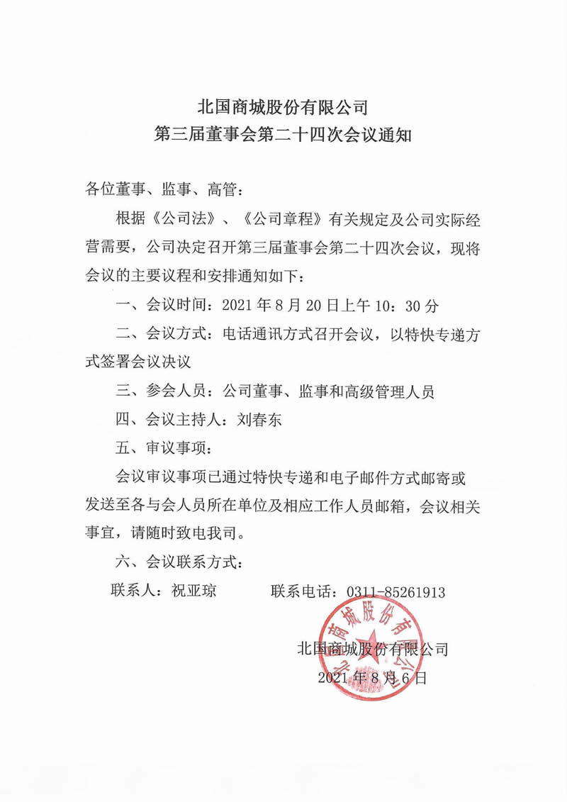 北国商城股份有限公司第三届董事会第二十四次会议通知