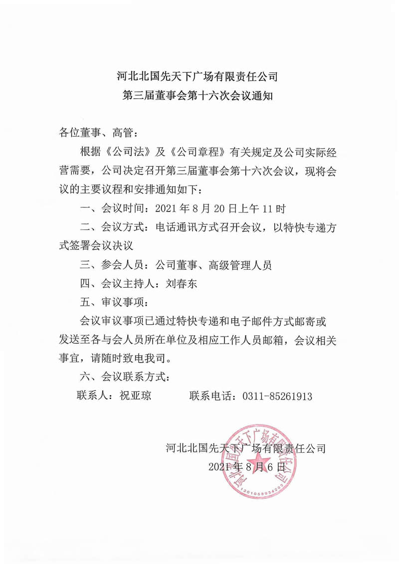 河北北国先天下广场有限责任公司第三届董事会第十六次会议通知