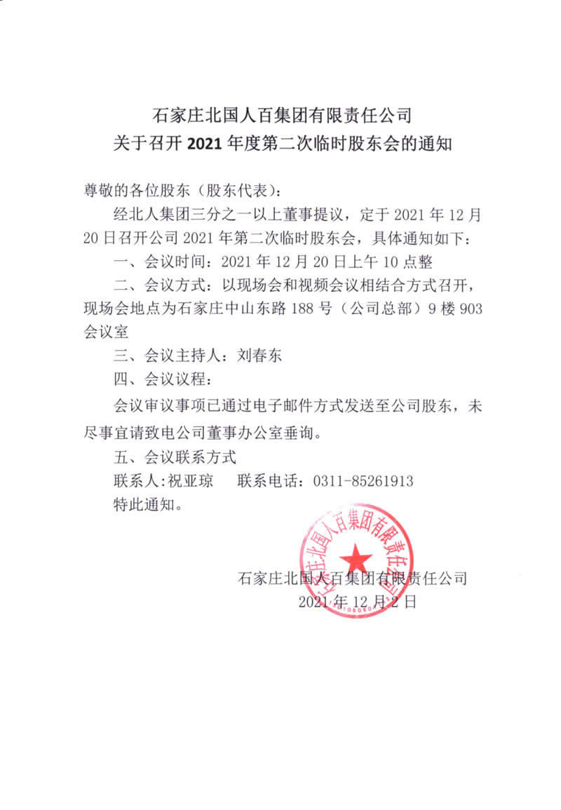 石家庄北国人百集团有限责任公司关于召开2021年度第二次临时股东会的通知