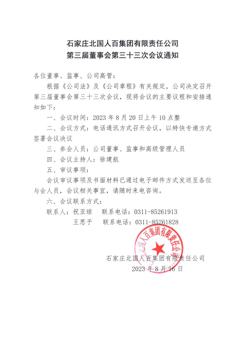 石家庄北国人百集团有限责任公司第三届董事会第三十三次会议通知