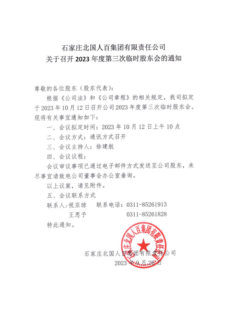 石家庄北国人百集团有限责任公司关于召开2023年度第三次临时股东会的通知