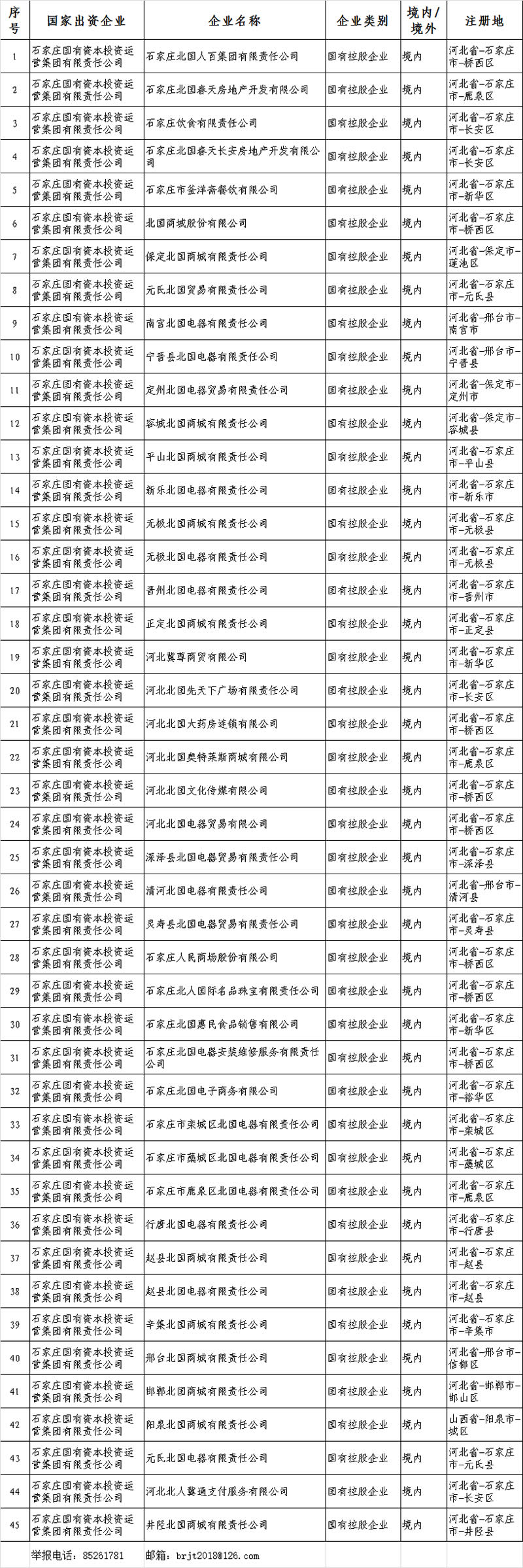石家庄北国人百集团有限责任公司全级次企业名单