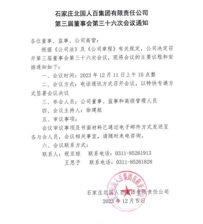 石家庄北国人百集团有限责任公司第三届董事会第三十六次会议通知