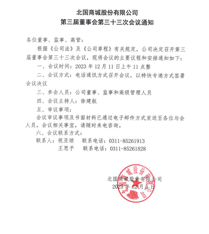 北国商城股份有限公司第三届董事会第三十三次会议通知