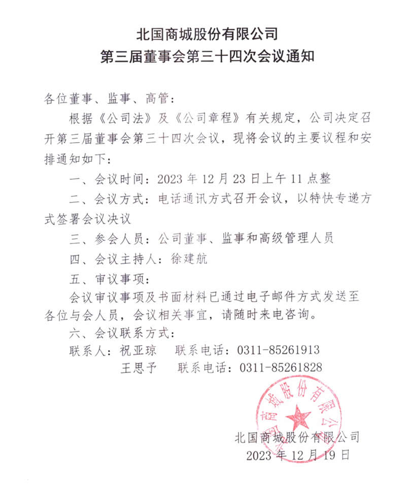 北国商城股份有限公司第三届董事会第三十四次会议通知