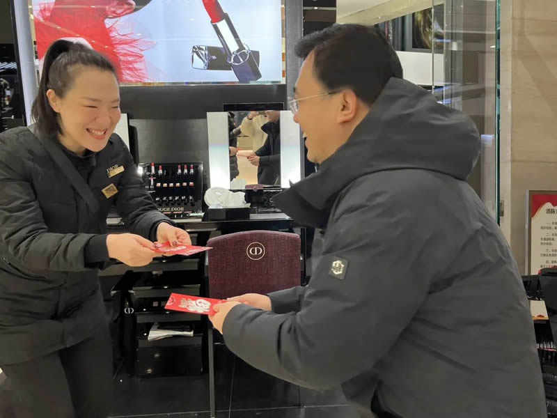 徐建航与现场顾客一一互动,为顾客朋友送上新年的祝福、小朋友们拿到龙年红包,高兴的欢呼雀跃!徐建航、刘隽、沈峥亲切慰问当天值班在岗的员工朋友,给员工们送上新年祝福红包!