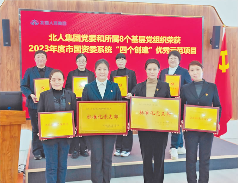 在市国资委系统“四个创建”专项工作中,北人集团党委及所属8个基层党组织荣获“四个创建”优秀示范项目,分别是北人集团党委荣获“党建示范点”;北国商城第一党支部、饮食公司燕风楼烤鸭店党支部荣获“标准化党支部”;北国商城品牌招商处、新百广场男装商场、燕风楼烤鸭店售货厅、北国奥莱安全保障组荣获“党员先锋岗”;饮食公司釜洋斋总店党支部、益新百货党支部荣获“示范性党员活动室”。