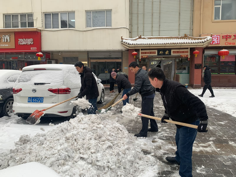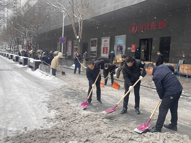 清雪现场,集团党员干部职工不顾严寒、相互配合,齐心协力清理道路上的冰雪,助力市民出行便利、顺畅。