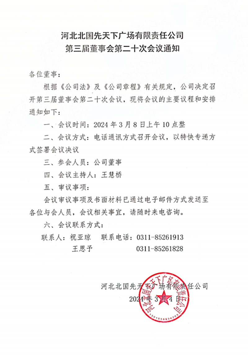 河北北国先天下广场有限责任公司第三届董事会第二十次会议通知