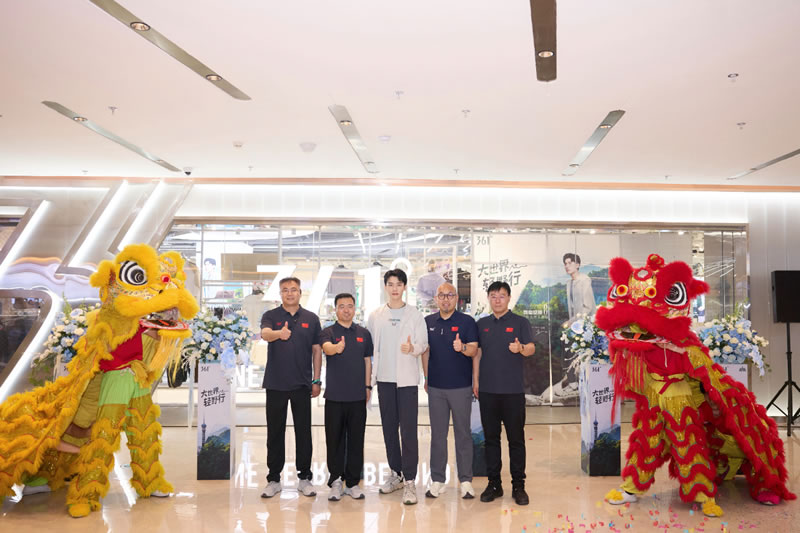 北人集团党委书记、董事长徐建航,361°集团副总裁兼品牌管理中心总经理郑业欣,361°河北分公司总经理王亚辉和361°全球品牌代言人龚俊,北国未来城负责人李栋为新店开业剪彩,共同祝贺361°北国未来城店开业大吉!
