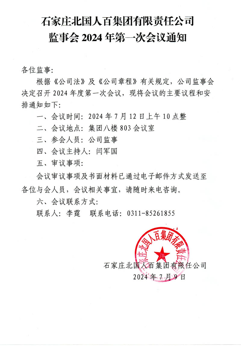 石家庄北国人百集团有限责任公司监事会2024 年第一次会议通知