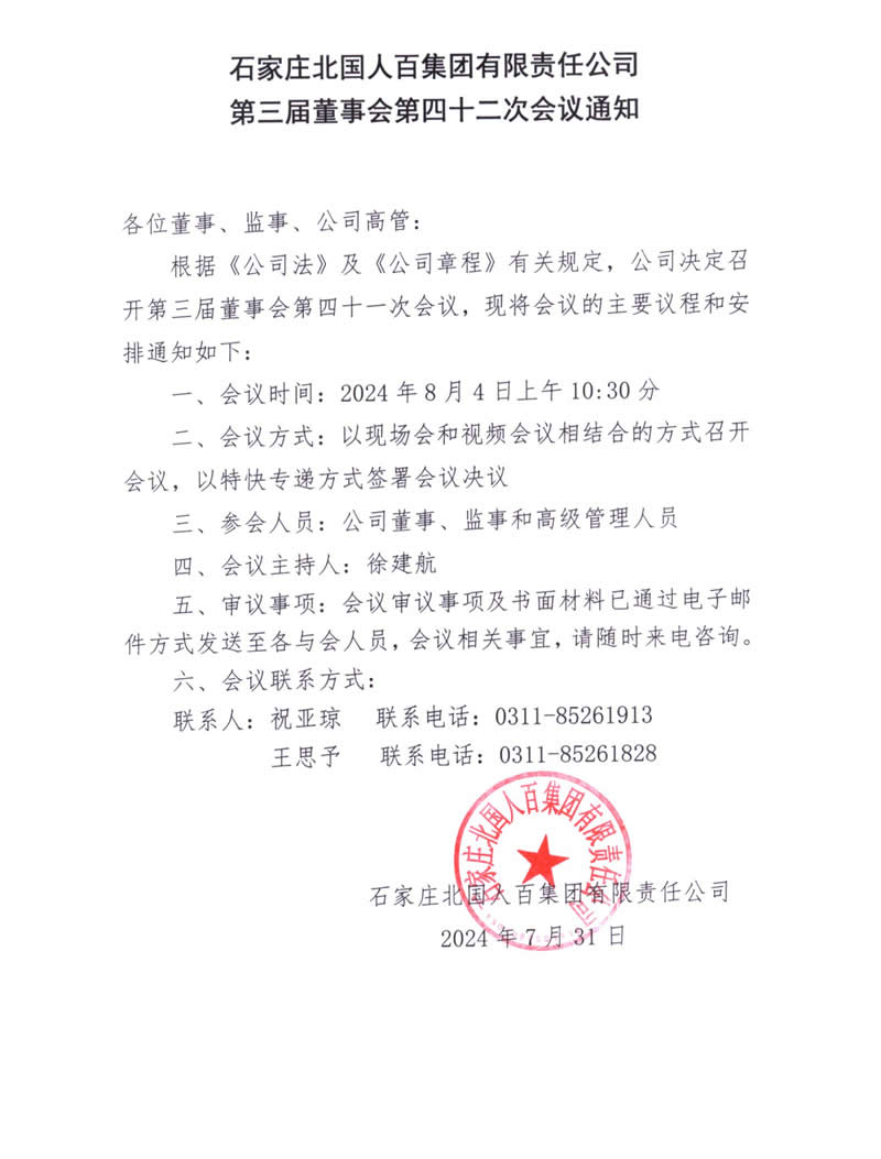 石家庄北国人百集团有限责任公司第三届董事会第四十二次会议通知