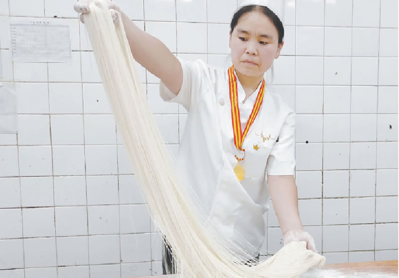 刘凯红自入职以来,始终坚守在白案岗位一线,对工作充满热情与执着。她不断钻研白案制作工艺,勇于创新,将传统技法与现代饮食理念相融合,开发出一系列深受消费者喜爱的面点产品。她练就了一手绝活——制作龙须面,抻面时如行云流水一般,抻出的面细如发丝,犹如一缕缕的龙须,故名龙须面。她制作的“金鱼龙须面、紫薯芝士饼”在参加石家庄市饭店餐饮行业职工中式面点职业技能竞赛活动中获得第一名好成绩,荣获“中式面点工种技术状元”称号。