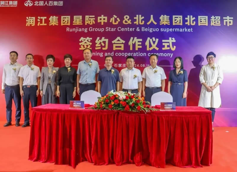 8月16日上午,润江集团星际中心与北人集团北国超市签约合作仪式在润江星际中心举行。石家庄高新技术产业开发区管理委员会党工委委员、管委会副主任赵善祥,党工委委员、人民武装部部长吴炳卫,河北润江投资集团有限公司董事长焦贺,总裁杨建炳,董事办主任宋丽贤,华润万象生活商业华北大区石家庄万象城总经理、石家庄高新万象汇/邯郸万象汇分管领导鲍颖,北人集团党委书记、董事长徐建航,党委副书记、副董事长、总经理胡文茹,北国股份副总经理白丽茹出席签约仪式。
