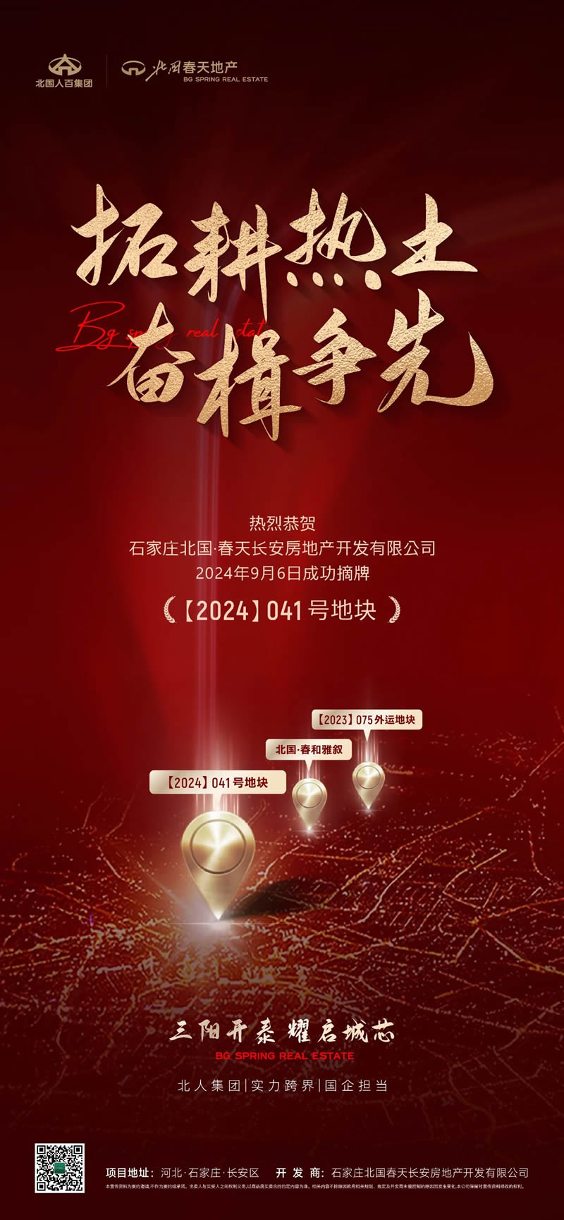 9月6日下午,北人集团旗下石家庄北国春天长安房地产开发有限公司再传捷报,成功竟得【2024】041稀缺地块。