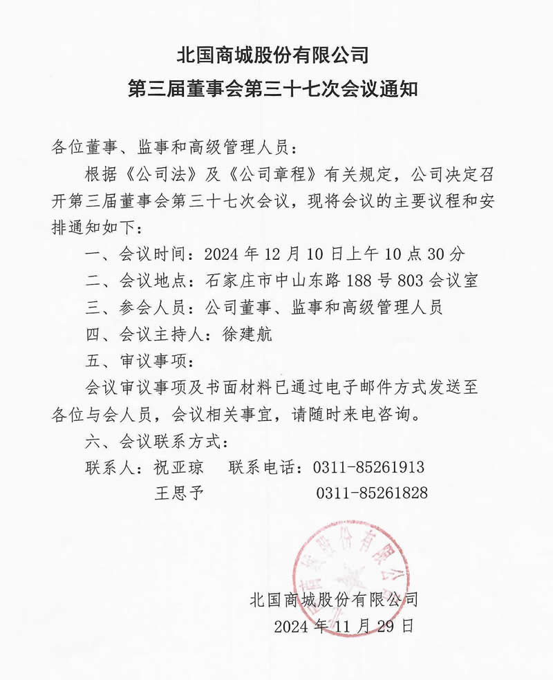 北国商城股份有限公司第三届董事会第三十七次会议通知