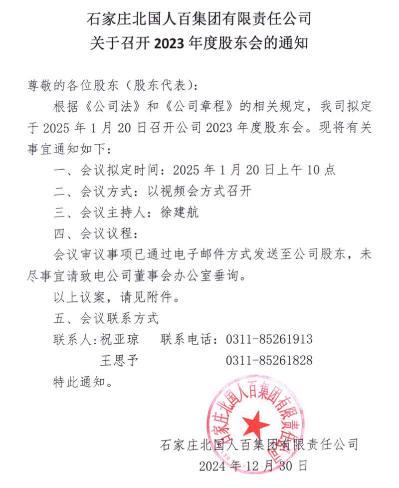 石家庄北国人百集团有限责任公司关于召开2023年度股东会的通知