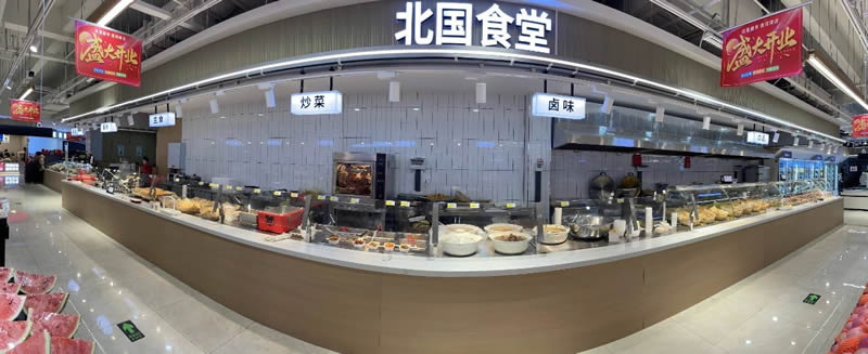北国超市清河湾店整体装修整洁明亮,店内扩大了鲜食区域,创新打造自营模式,开设北国食堂,提升现制、熟食等鲜食比例,增加现烤现炸、现炒现熬、明厨亮灶等场景,同时增设堂食区、顾客休息区及自助服务区,充分满足社区定位需求,为消费者提供更加安全、方便、舒适的购物环境。