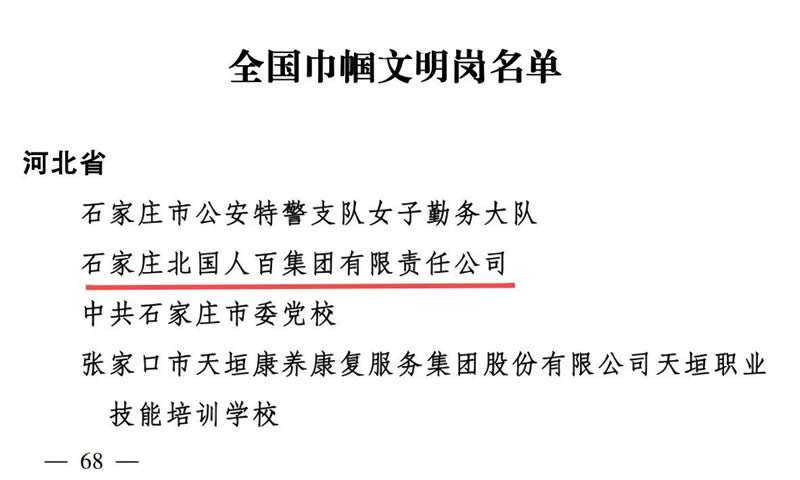 《全国妇联女性之声》2月28日报道,为表彰先进、树立榜样,激励广大妇女自尊自信、自立自强,奋进新征程、建功新时代,积极投身中国式现代化建设,全国妇联决定,授予王志勤等10人全国三八红旗手标兵称号,授予张晓欢等596人全国三八红旗手称号,授予首都医科大学附属北京妇产医院北京妇幼保健院等395个单位全国三八红旗集体称号,授予北京市城建园林金都公司绿化三大队天安门广场特养班组等599个单位全国巾帼文明岗称号。其中,北人集团荣获“全国巾帼文明岗”称号。