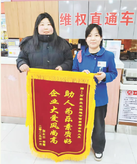 临近闭店,两位二十来岁的小姑娘焦急的跑到服务台说手机丢了。高然然第一时间安抚女孩情绪并报警。她根据两个女孩的购物路线帮助女孩确定了结款时间及款台编号,以便查验监控,又将女孩送到监控室,协助警察帮助女孩查找手机,最终在大家的共同努力下女孩的手机失而复得。本以为事情就这样告一段落,没几天两个女孩再次来到服务台送上锦旗。看到锦旗上写道:赠北国超市西美店全体人员,助人为乐素质好,企业大爱风尚高,高然然心里别提多开心了。