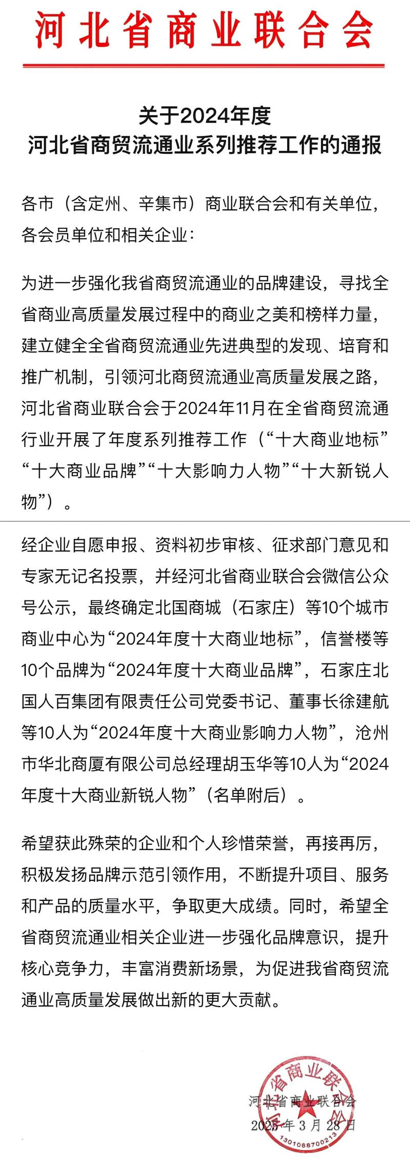 为进一步强化河北省商贸流通业品牌建设,寻找全省商业高质量发展过程中的商业之美和榜样力量,建立健全全省商贸流通业先进典型的发现、培育和推广机制,引领河北商贸流通业高质量发展之路,河北省商业联合会在全省商贸流通行业开展年度系列推荐工作。经评选,北人集团党委书记、董事长徐建航被评为“2024年度十大商业影响力人物”。集团旗下北国商城、北国先天下被选为“2024年度十大商业地标”。