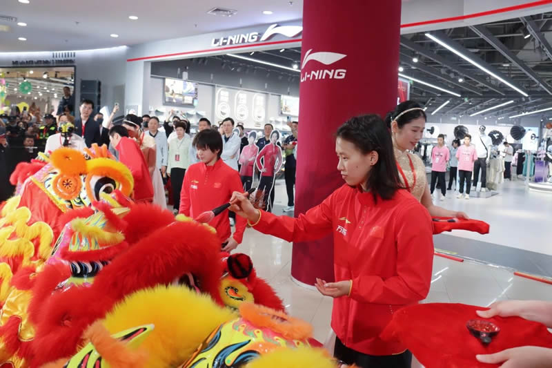 在北国商城5层李宁新店共鉴会现场,三位冠军为舞狮点睛,与河北省体育局财务保障和产业服务中心主任郝岩,跃翔体育集团董事长马连军,北人集团党委书记、董事长徐建航,党委副书记、副董事长、总经理胡文茹等领导一起为新店开业剪彩,祝贺李宁北国商城店开业大吉!