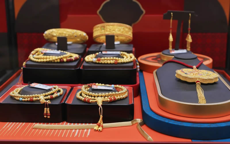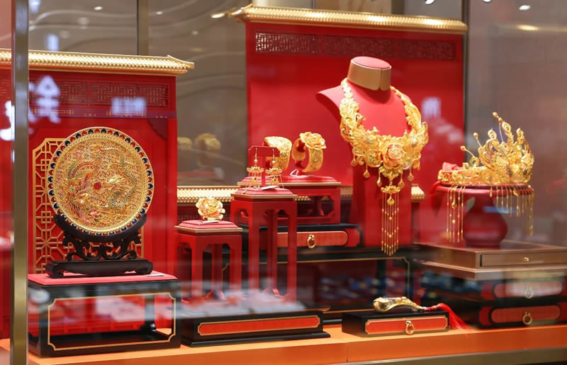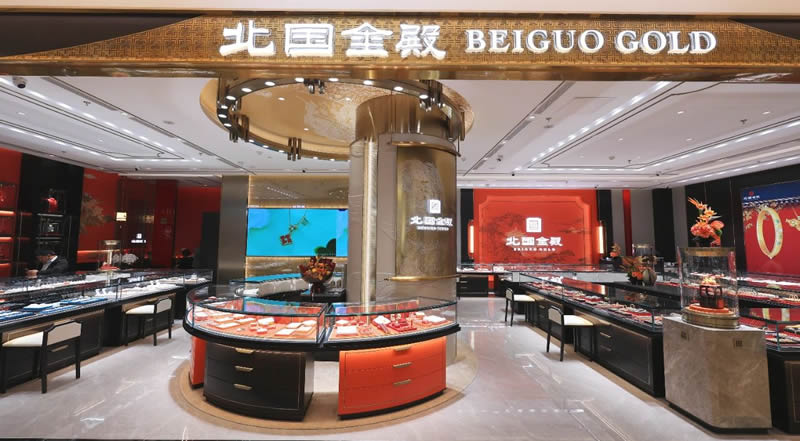 北国金殿全新开业后,门店形象、货品呈现、服务能力全面升级,打造“宫殿级”美学空间与创新服务,将中华文化的历史底蕴与当代时尚相融,打破传统金店封闭陈列,以故宫宫殿建筑美学为蓝本,撷取宫廷配色作为北国金殿色彩搭配美学,将斗拱结构化作展柜线条,呈现古香古韵的美感。