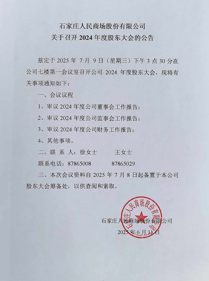 石家庄人民商场股份有限公司关于召开2024年度股东大会的公告