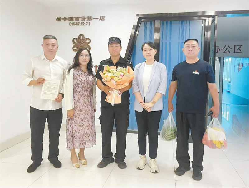6月12日傍晚,新百广场安保员董树超在西北门例行勤务时,发现慢车道上有一个被遗落的手提包,他立即将手提包上交给主管领导。经清点,包内装有现金24000余元,以及身份证、银行卡、学习资料等重要物品。为尽快归还失主,在主管领导的协调下,董树超随即将财物移交至辖区中山路派出所。通过多方查找,最终成功找到失主并归还所有财物。6月13日,失主专程送来鲜花和表扬信,对董树超拾金不昧的高尚品德表示衷心感谢,并对公司培养出如此优秀的员工给予高度赞扬。