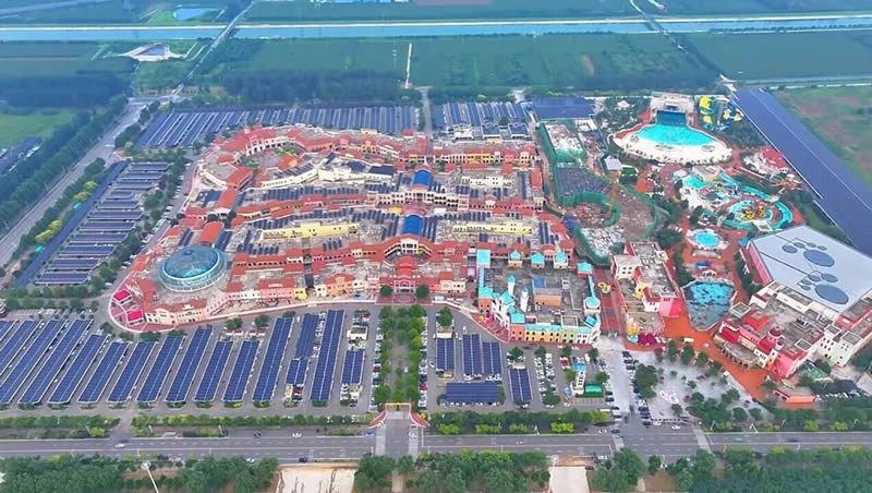 项目以高标准车棚为基础,顶部铺设高效率单晶硅光伏组件,数千块深色光伏板整齐列阵,高效转化太阳能为绿色电力,既解决了传统停车场功能单一的问题,又为北国奥莱小镇构筑起守护可持续发展的“能源方舟”,自投入运营以来,带来了可观的经济效益及环境效益。据统计,奥莱项目年发电量约900万度,发电自用率达85%,可直接满足园区内品牌店铺、照明系统、空调系统及公共设施的用电需求,相当于2500户城市家庭一年的用电量,年节约费用约120万元;水世界项目年发电量约800万度,年节约费用约35万元。